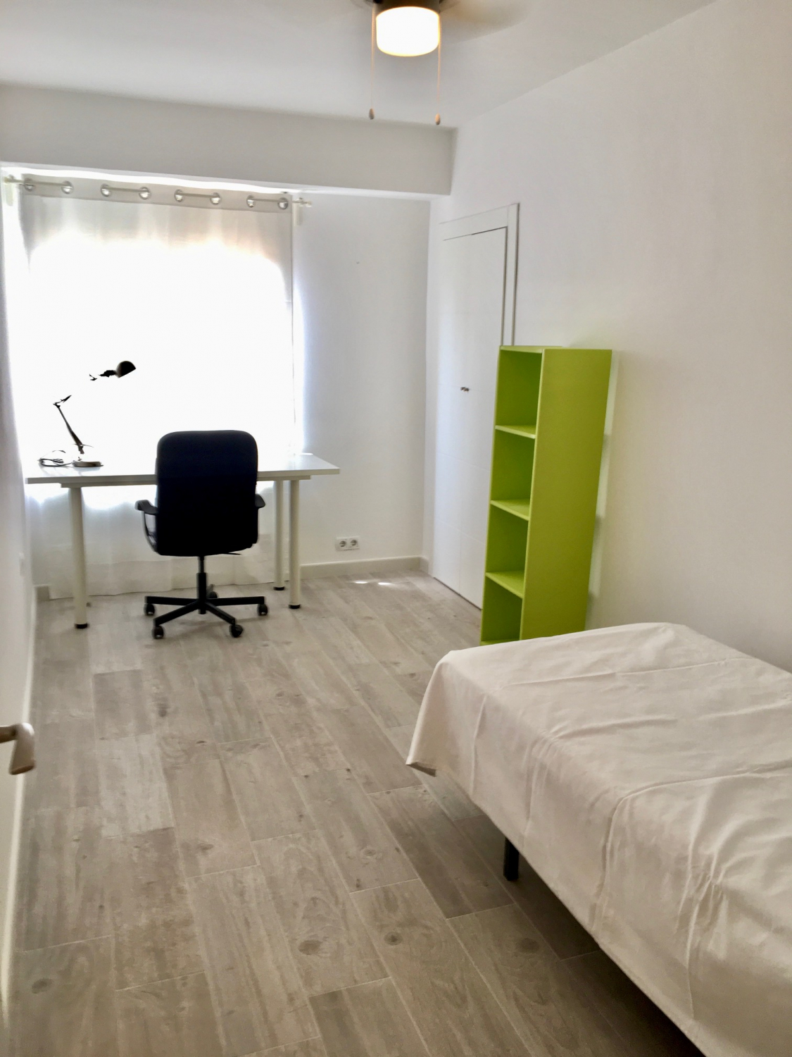 Todas sus habitaciones disponen de grandes ventanales que aportan alegría y mucha luz. Cada habitación dispone de todo lo necesario para hacer tu estancia confortable y cubrir todas tus necesidades para estudiar, mesa grande, estanterías y por supuesto armarios empotrados con capacidad suficiente para mantener tu habitación ordenada.